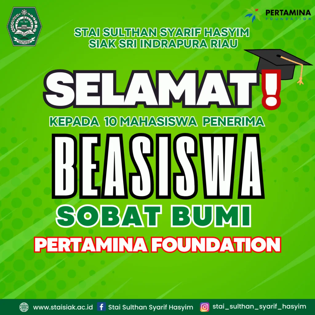 Pimpinan dan Civitas Akademika STAI Sulthan Syarif Hasyim Siak, mengucapkan Tahniah wa Innalillah kepada 10 Mahasiswa STAI Sulthan Syarif Hasyim Siak sebagai Penerima Beasiswa Sobat Bumi, Pertamina Foundation tahun 2023. Semoga menjadi motivasi dalam belajar dan lebih meningkatkan mutu dalam pendidikan serta meraih gelar sarjana. Terima kasih juga kepada semua yang telah mendaftar beasiswa. Teruslah