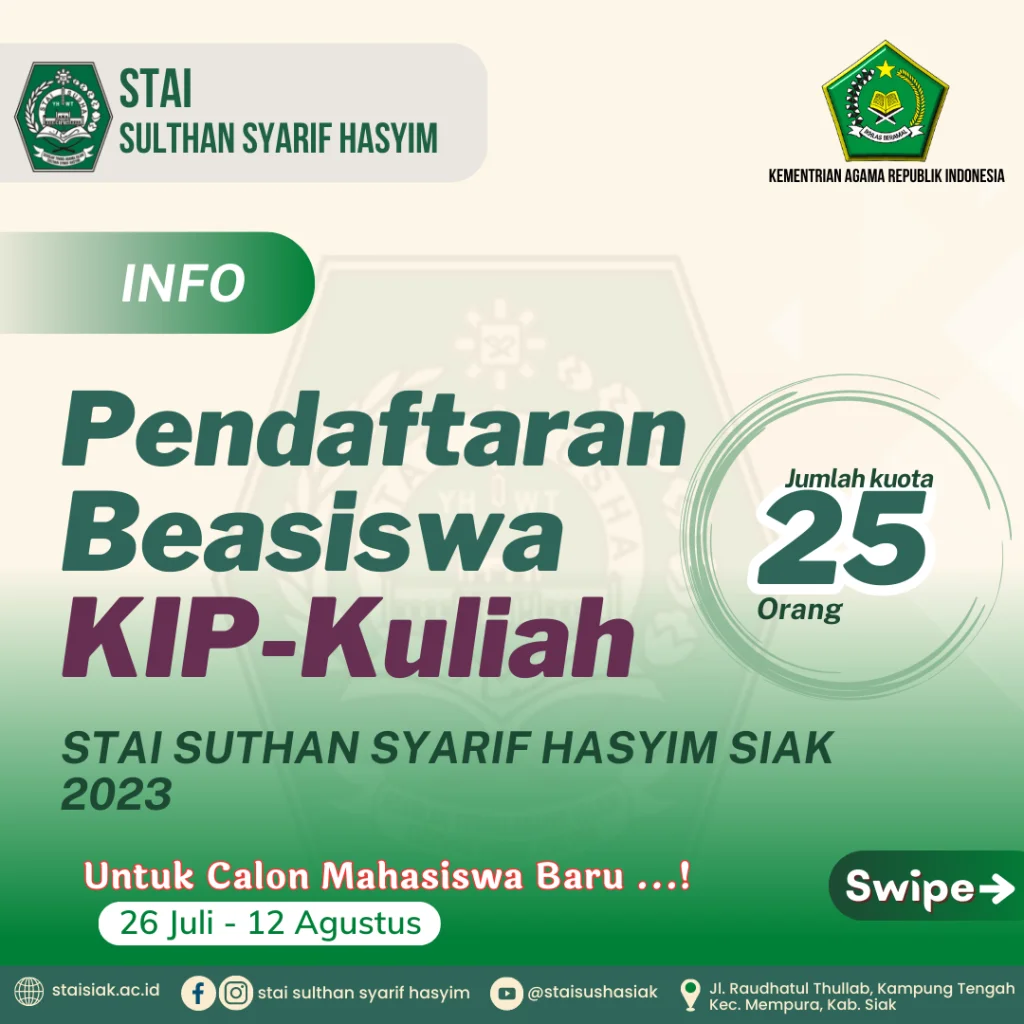 PENGUMUMAN PENDAFTARAN CALON PENERIMA BEASISWA KIP KULIAH SEKOLAH TINGGI AGAMA ISLAM (STAI) SULTHAN SYARIF HASYIM SIAK SRI INDRAPURA RIAU