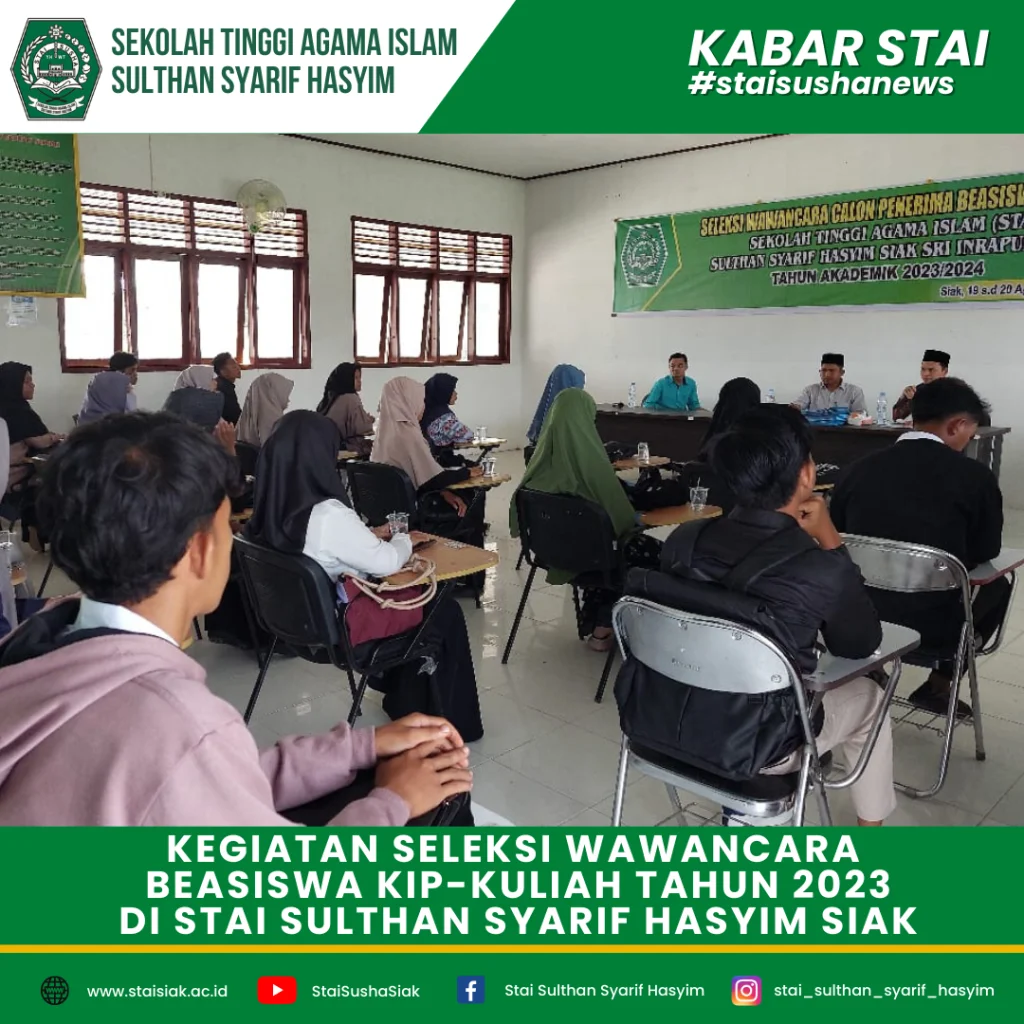 Siak (STAISusha) – Civitas Akademik STAI Sulthan Syarif Hasyim Siak melakukan seleksi wawancara calon penerima beasiswa Kartu Indonesia Pintar (KIP) Kuliah  Semester Ganjil Tahun Akademik 2023/2024, pada 19 s.d 20 Agustus 2023. Wawancara ini diikuti oleh 43 peserta yang telah lulus penerimaan mahasiswa baru dan seleksi administrasi di STAI Sulthan Syarif Hasyim Siak. Seleksi wawancara