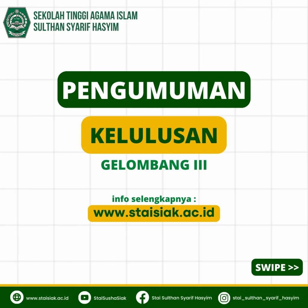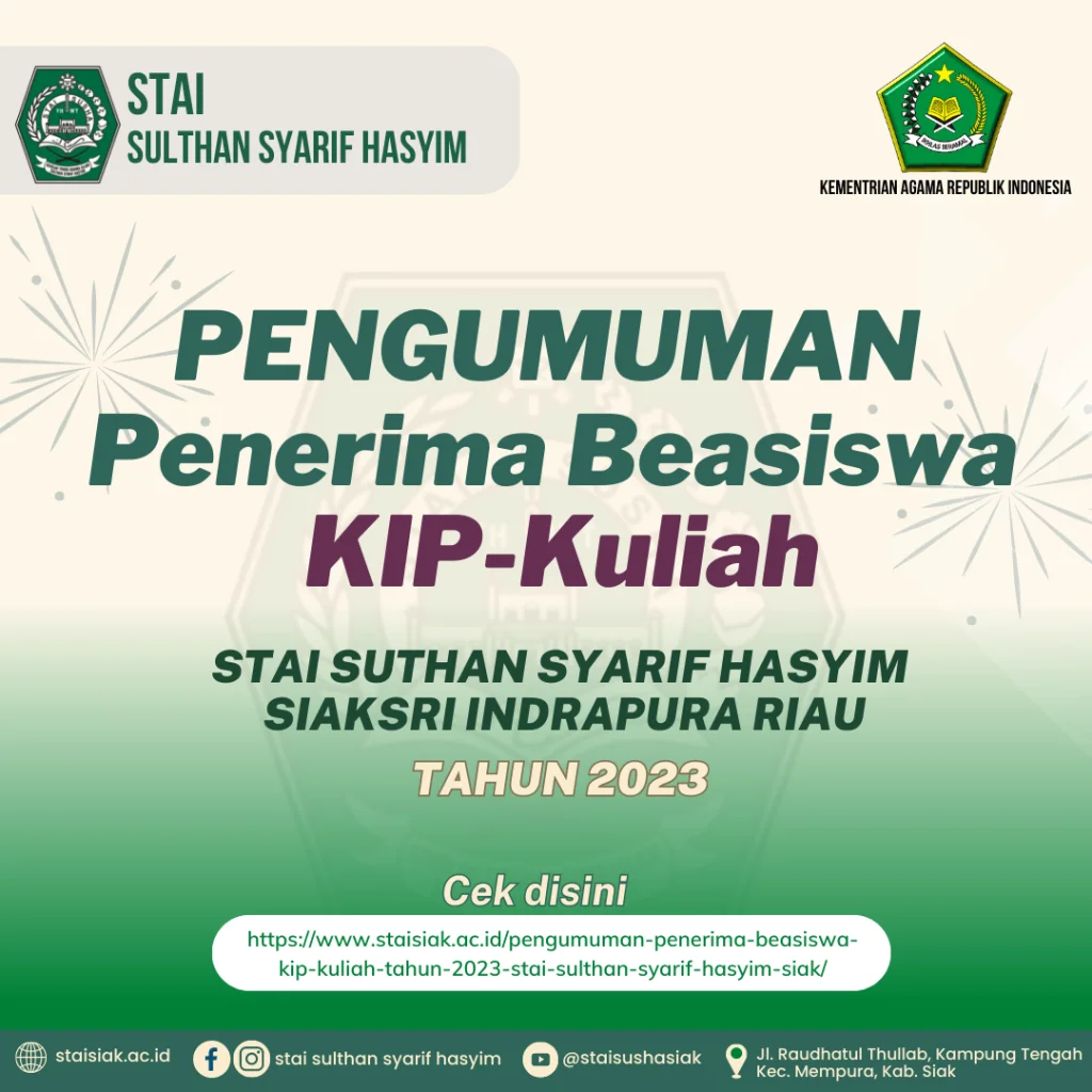 Selamat kepada 25 Mahasiswa Penerima Beasiswa KIP-Kuliah tahun 2023 Sekolah Tinggi Agama Islam (STAI) Sulthan Syarif Hasyim Siak Sri Indrapura. Berdasarkan hasil seleksi administrasi dan wawancara calon mahasiswa penerima Beasiswa KIP Kuliah oleh Tim Verifikator, telah ditetapkan nama-nama calon mahasiswa sebagai Penerima Beasiswa KIP Kuliah tahun 2023.  Cek disini “Pengumuman Penerima KIP Kuliah 2023” Kepada