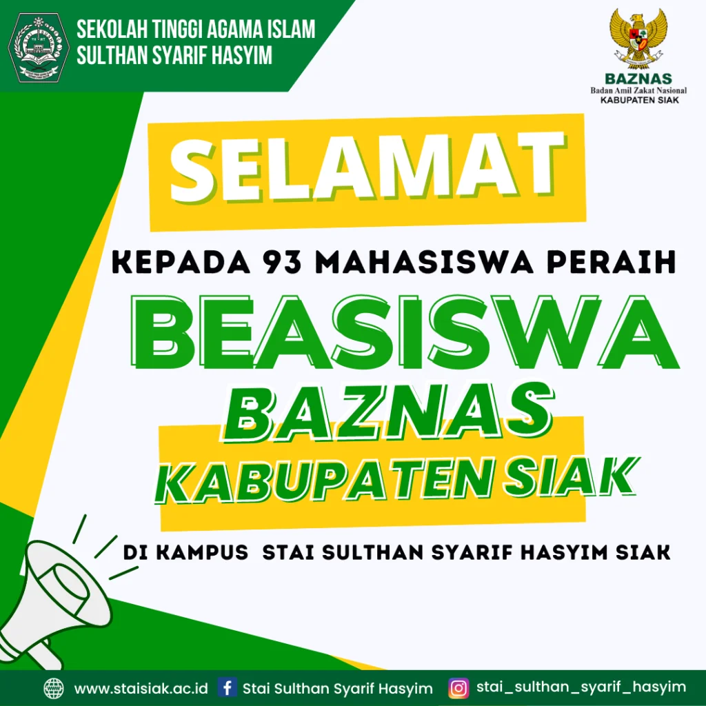 Alhamdulillah, Selamat Kepada 93 Mahasiswa/i STAI Sulthan Syarif Hasyim Siak sebagai Penerima Beasiswa BAZNAS Kabupaten Siak. Pada hari Rabu (02/08/2023) BAZNAS (Badan Amil Zakat Nasional) Kabupaten Siak, mengeluarkan Keputusan Ketua Badan Amil Zakat Nasional Kabupaten Siak Nomor : 01.79/SK/BAZNAS-S/VIII/2023 Tentang Penetapan Bantuan Beasiswa Perguruan Tinggi Program Siak Cerdas Badan Amil Zakat Nasional Kabupaten Siak Tahun