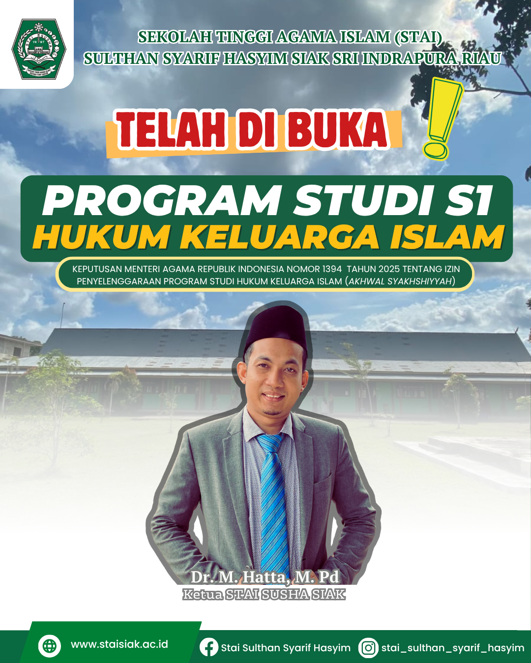 Dalam poster pengumuman, terlihat jelas sosok Dr. M. Hatta, M.Pd., Ketua STAI SUSHA Siak. Kehadirannya menjadi simbol komitmen institusi dalam menghadirkan program studi berkualitas. Beliau menegaskan bahwa pembukaan prodi baru ini adalah upaya STAI SUSHA untuk memperluas jangkauan layanan pendidikan dan mencetak sarjana yang siap berkontribusi dalam penegakan hukum dan keadilan, khususnya di lingkungan peradilan agama.